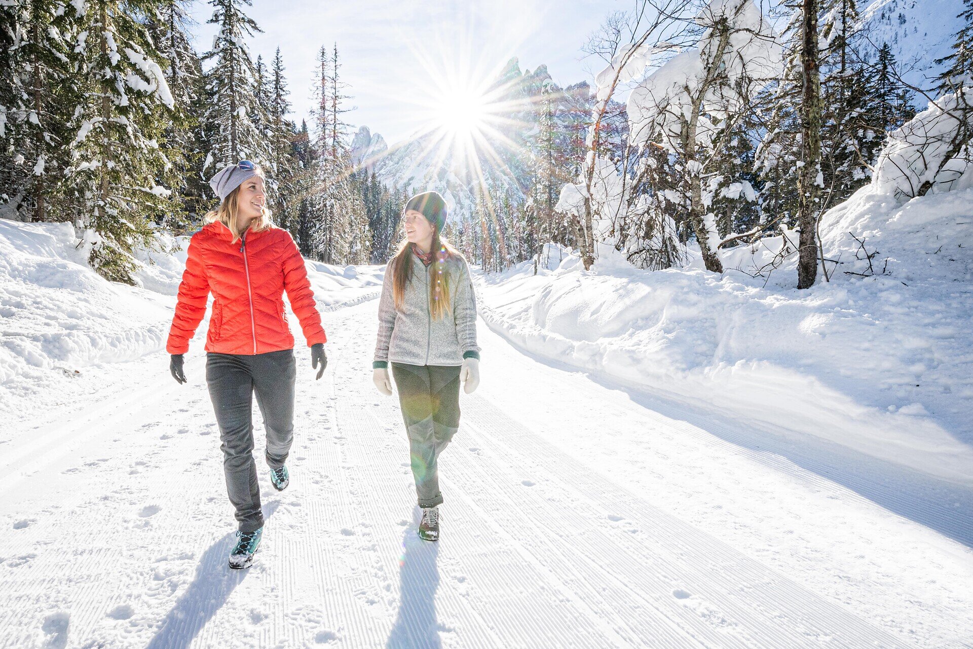 Die Winterwanderung beginnt beim Gasthof Panorama, wo sich etwas oberhalb ein kleiner Parkplatz befindet. Von dort folgt man dem breiten Weg Nr. 13 in Richtung Klammbachalm. Die ersten rund 500 Meter verlaufen eben auf einer asphaltierten Straße. Anschließend überquert man eine kleine Brücke. Nach der Brücke geht es leicht ansteigend weiter. Nach etwa 400 Metern erreicht man eine Weggabelung, bei der man dem rechten Weg in Richtung Helmhanghütte folgt. Kurz darauf durchquert man ein etwa 50 Meter langes Waldstück. Danach öffnet sich die Landschaft, und man genießt einen schönen Ausblick auf die Sextner Sonnenuhr. Wenige Minuten später erreicht man die Helmhanghütte, die direkt an der Piste liegt und zur Einkehr einlädt.