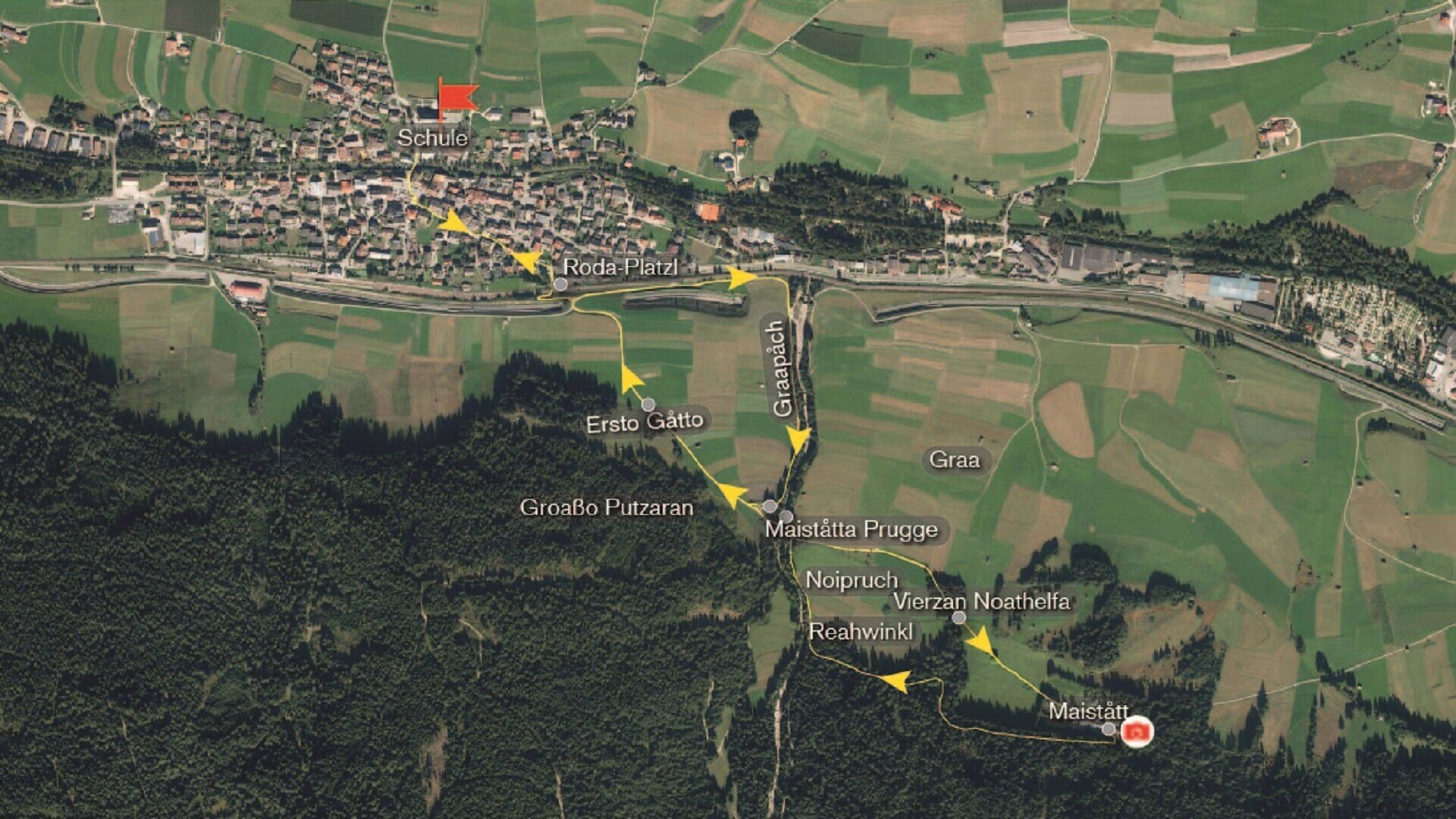 Our walk begins at the Elementary School. We cross the small bridge over the square, and soon arrive at Von Kurz Square. Facing the City Hall, we head east along Jakob-Traunsteiner Street, following it until it merges briefly with Johann-Jaeger Street. A short walk brings us to the small, peaceful square known as “Roda-Platzl”. We continue by passing through a nearby railroad underpass, then follow the road Maistatt up to its first gentle hill. At the top, we turn left and descend along a path that runs close to the railway, heading east. After another railroad underpass, we reach the area known as Graapach. Just before the bridge, we turn right until we rejoin the Maistatt Road. Here we cross the “Maiståtta Prugge” bridge. On the left stands a small pillar shrine dedicated to St. John of Nepomuk, protector of bridges and travelers. We continue along the road through Pian di Maia. On the right, the Noipruch fields stretch out into the distance, while to the left lie the fields of Graa. The path here is mostly flat but gradually ascends, leading us to a votive column dedicated to the Vierzan Noathelfa, the Fourteen Holy Helpers. We proceed a little further and arrive at Maistått once again. There we find a beautiful historic building, with a small chapel to St. Nepomuk. Behind the house, flows a thermal spring. From the spring, a narrow forest path leads westward, following the stream through the woods. We pass a manger for forest animals, then turn left onto a peaceful forest trail, which brings us to the Reahwinkl forest road. From here, we enjoy a lovely view of Ratsberg (Mount Rota) and the distant St. Mary’s Church, a well-known place of pilgrimage. Descending from Reahwinkl, we make our way back to the Maiståtta-Prugge Bridge. Turning left, we follow Maistatt Road back toward the village. On our left stretches the called Groaße Putzaran, which extends until we reach the area known as Ersto Gåtto / Kiagåtto (Gåtto meaning “fence”). We continue along the same road, pass once more through the railroad underpass, and return to the familiar Roda-Platzl. From there, it’s just a short walk back to the Elementary School.