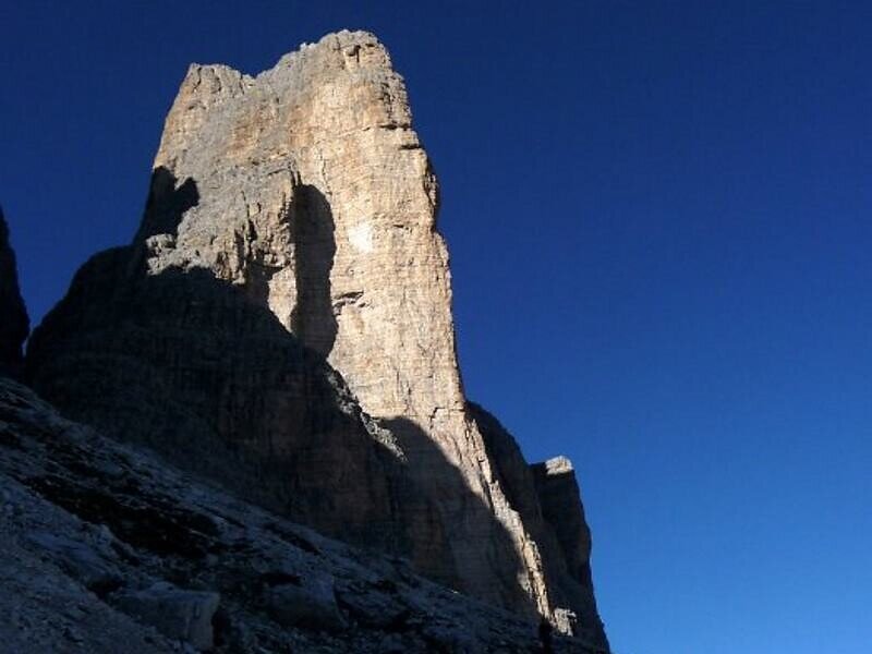 One of the most beautiful routes of E. Comini winds along the overhanging south-buttress of the Cima Piccola, with a height of 350 m. Under climbers it’s known as „Spigolo Giallo“.