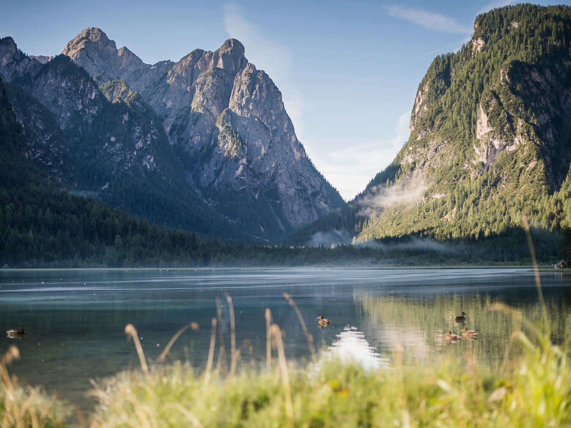 From Niederdorf/Villabassa via Toblach/Dobbiaco, Dürrensee lake to Cortina and back. Here the mountain panorama of the Dolomites UNESCO World Heritage dominates the landscape.