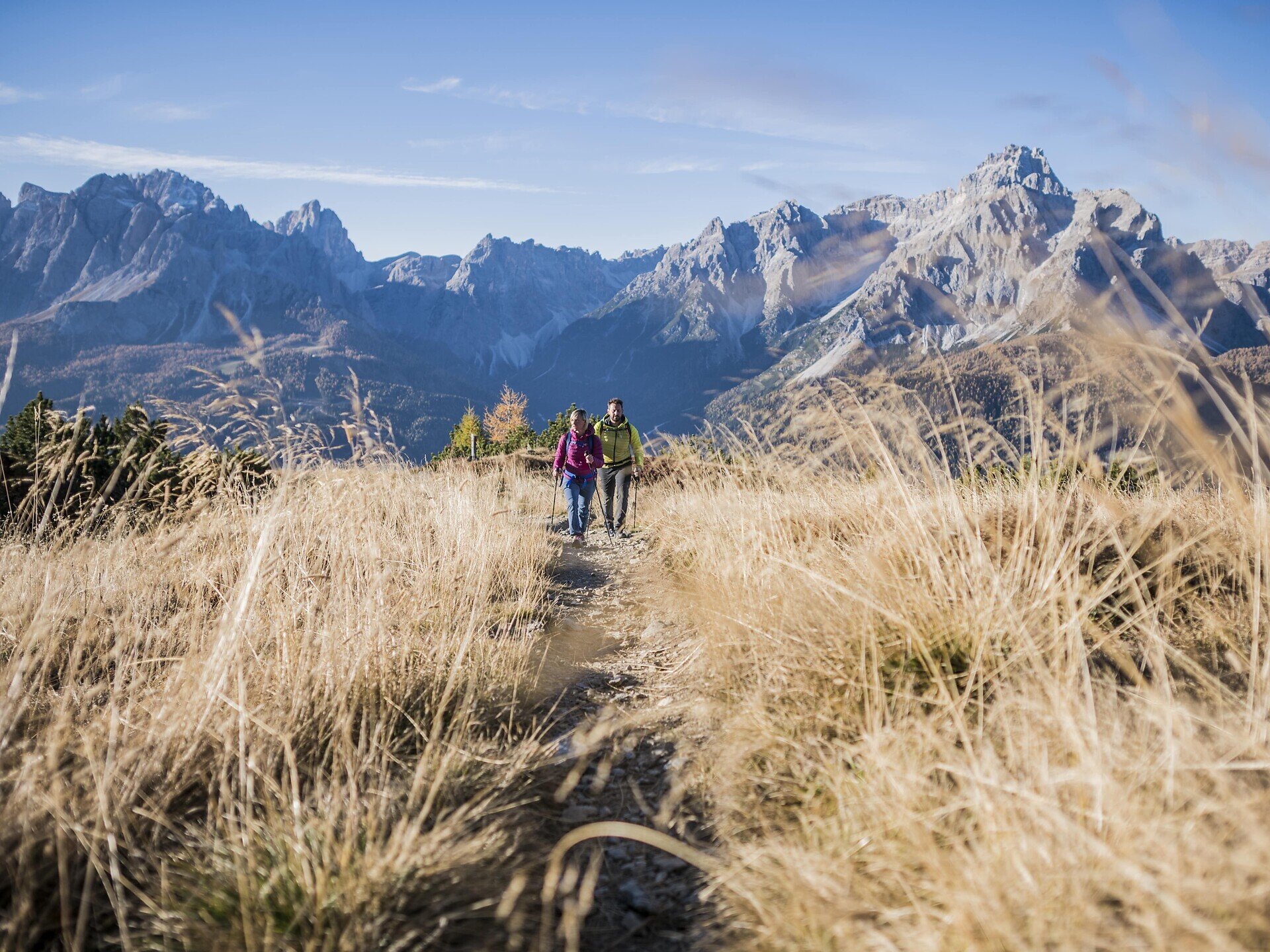 From the Kreuzbergpass (accessible by bus or car - parking fee applies), hike on trail No. 131 through picturesque high moor meadows to the Nemesalm (1,877 m), where wide pastures with horses and cows spread out against the impressive backdrop of the Sexten Dolomites. From the alpine pasture, continue eastwards on trail No. 146 along the northern side of the valley, finally climbing somewhat more steeply via the Dechantmahd with a small shepherd's hut up to the Kniebergsattel (2,329 m). There, the path to the Obstanserseehütte or the Carnic High Trail branches off to the left; keeping right, you reach a mountain ridge via well-laid serpentines on trail No. 148. From there, you round the summit on the south side across a scree field and finally climb to the summit of the Knieberg via a slightly exposed but easily accessible path. The descent takes place on trails No. 173 and No. 149 down to the Coltrondo Alm, past the idyllic Lago dei Rospi, and finally back to the Kreuzbergpass, from where you can walk along the stream to Moos or return comfortably by bus.