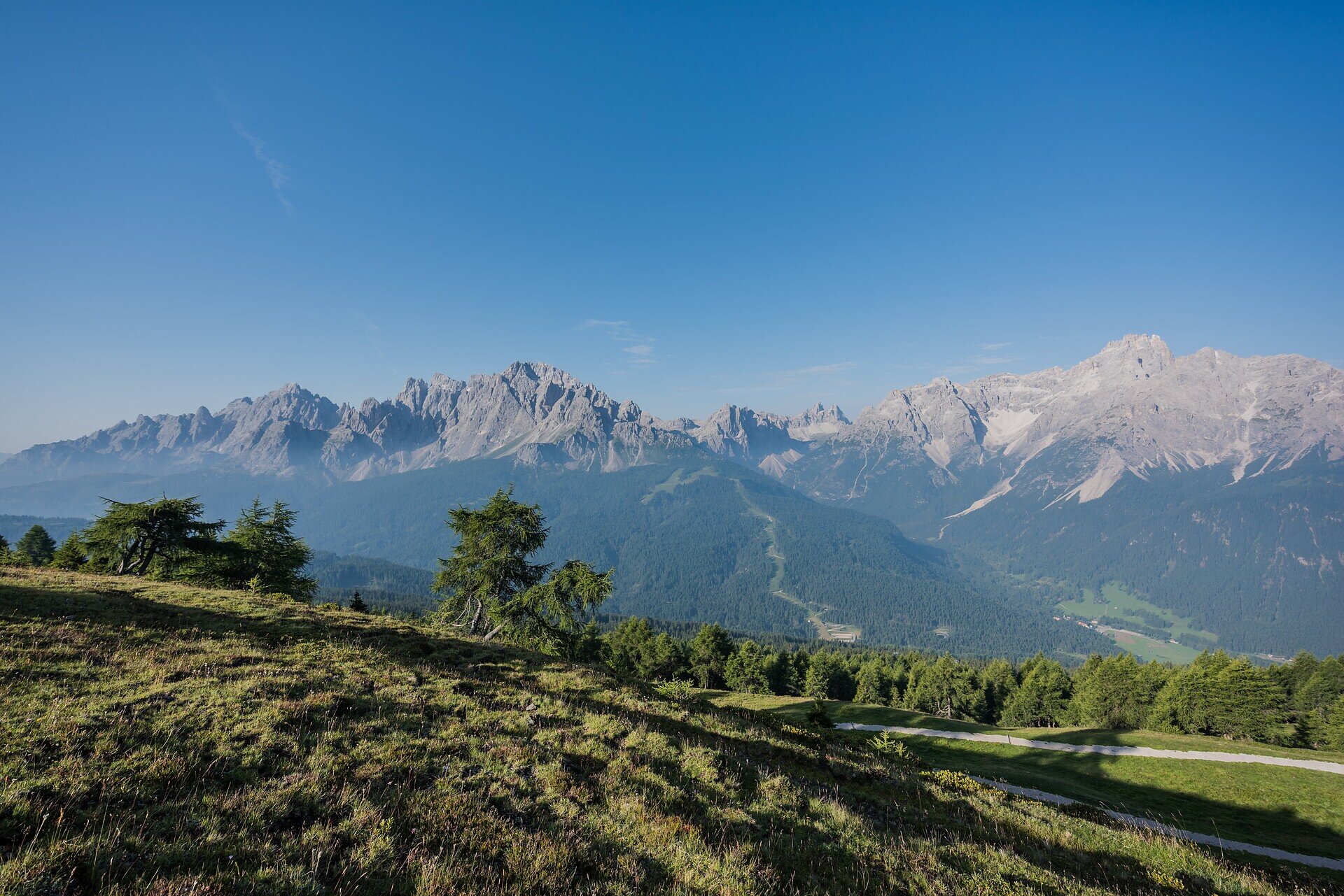 Starting from fortress Mitterberg (public parking lot) – via Gasthof Panorama (1576 m) – you hike along a forest road (path no. 13) to the Helmhanghütte hut (1605 m). From there, the hike can be extended as desired towards the Sexten Alpine Pastures.