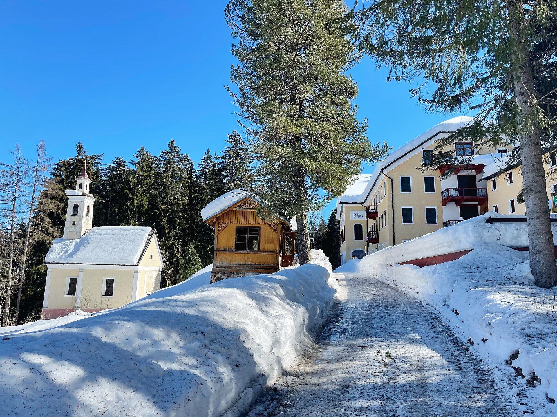 Starting from the main square in Niederdorf, this peaceful winter hike follows trail no. 27 toward Maistatt. The partly paved path leads you through a picturesque winter landscape – past snowy meadows, quiet fields, and old wooden fences frosted with ice.