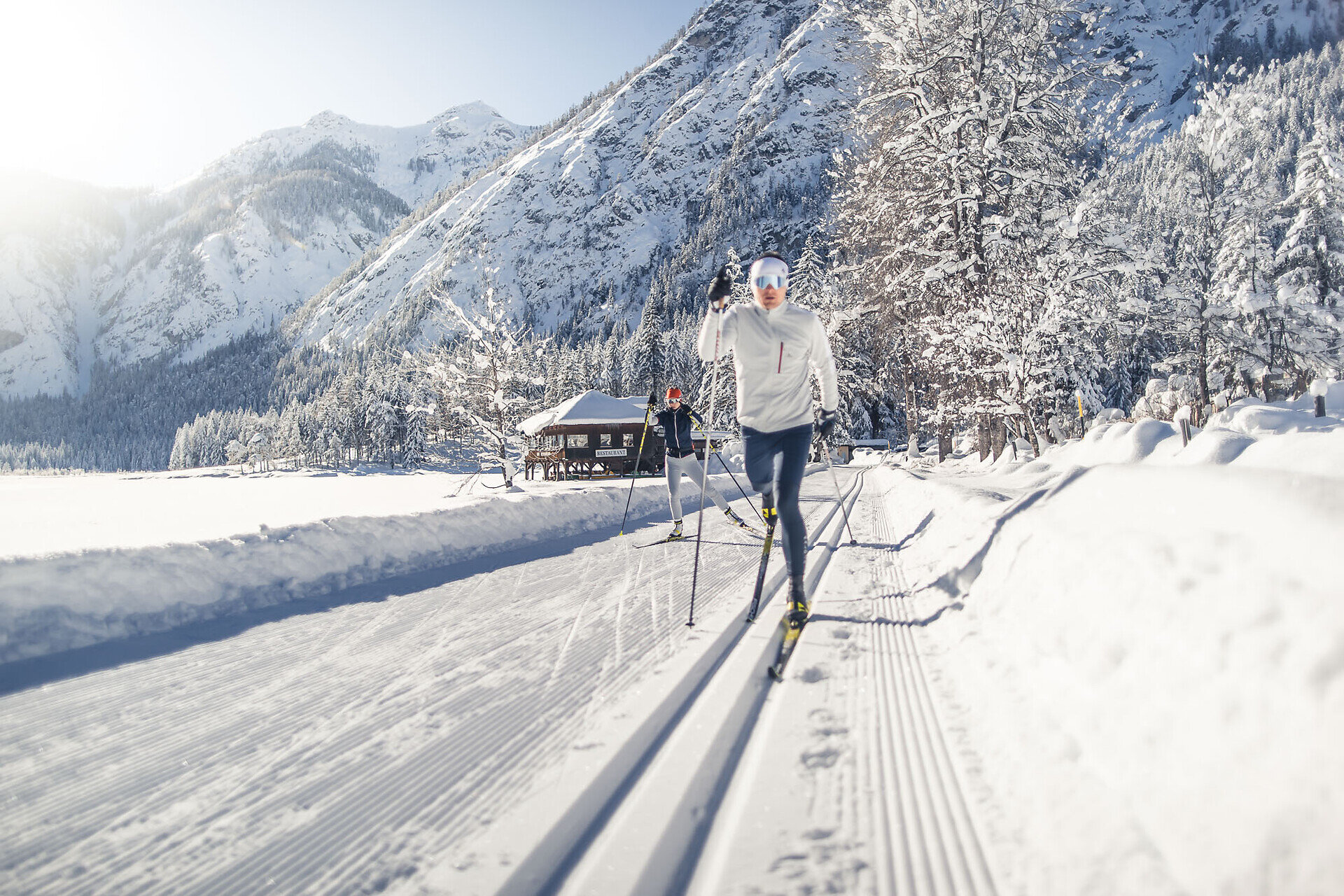 Immersa nella natura innevata sul lato sud del Lago di Dobbiaco. Questa breve variante collega lo spondo est e lo spondo ovest del lago.