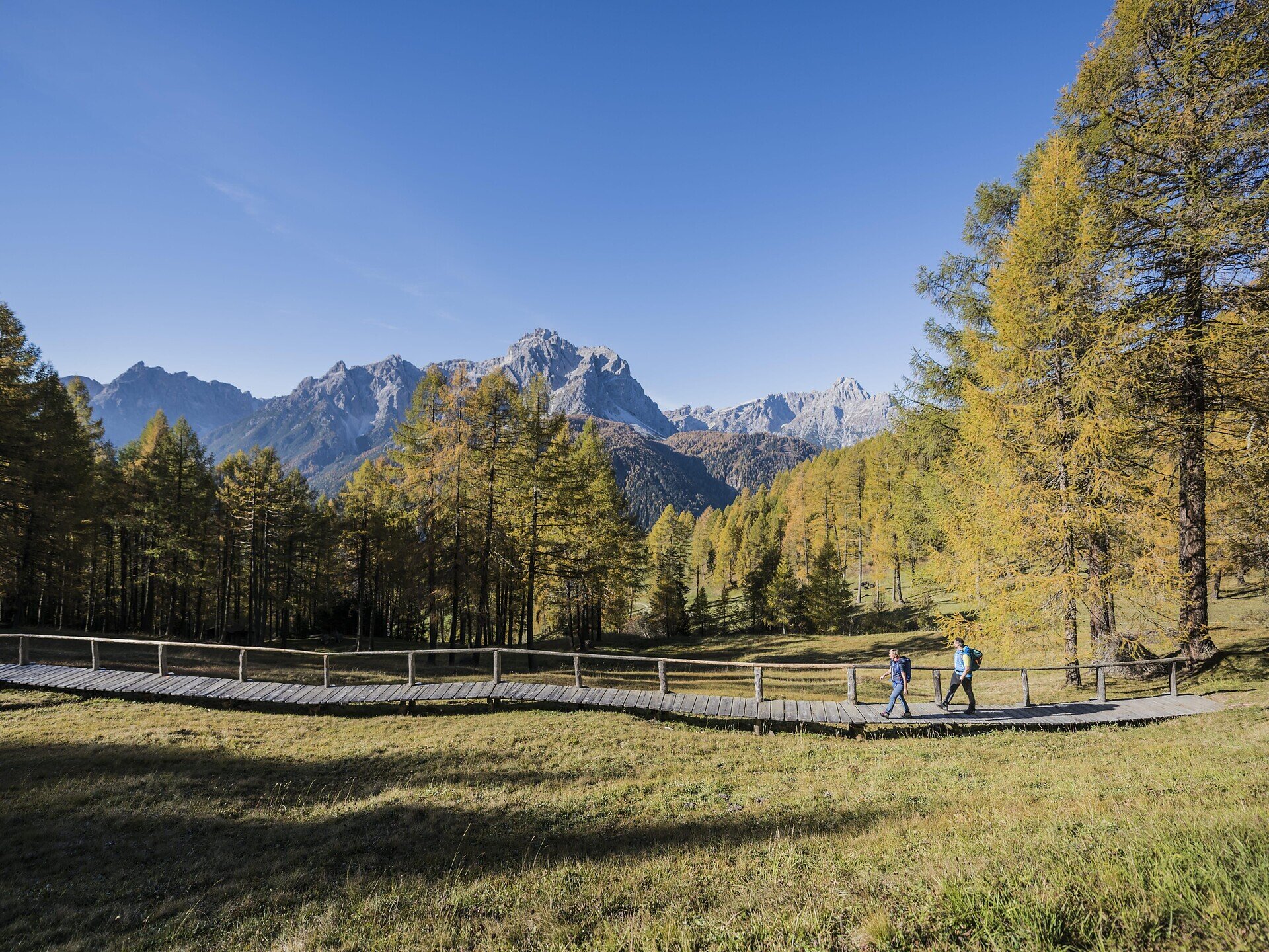 Piacevole passeggiata dal forte Mitterberg/Monte di Mezzo - Albergo Panorama - fino al rifugio Pendio Monte Elmo. Splendida vista sul paese Sesto, raggiungibile con il passeggino.