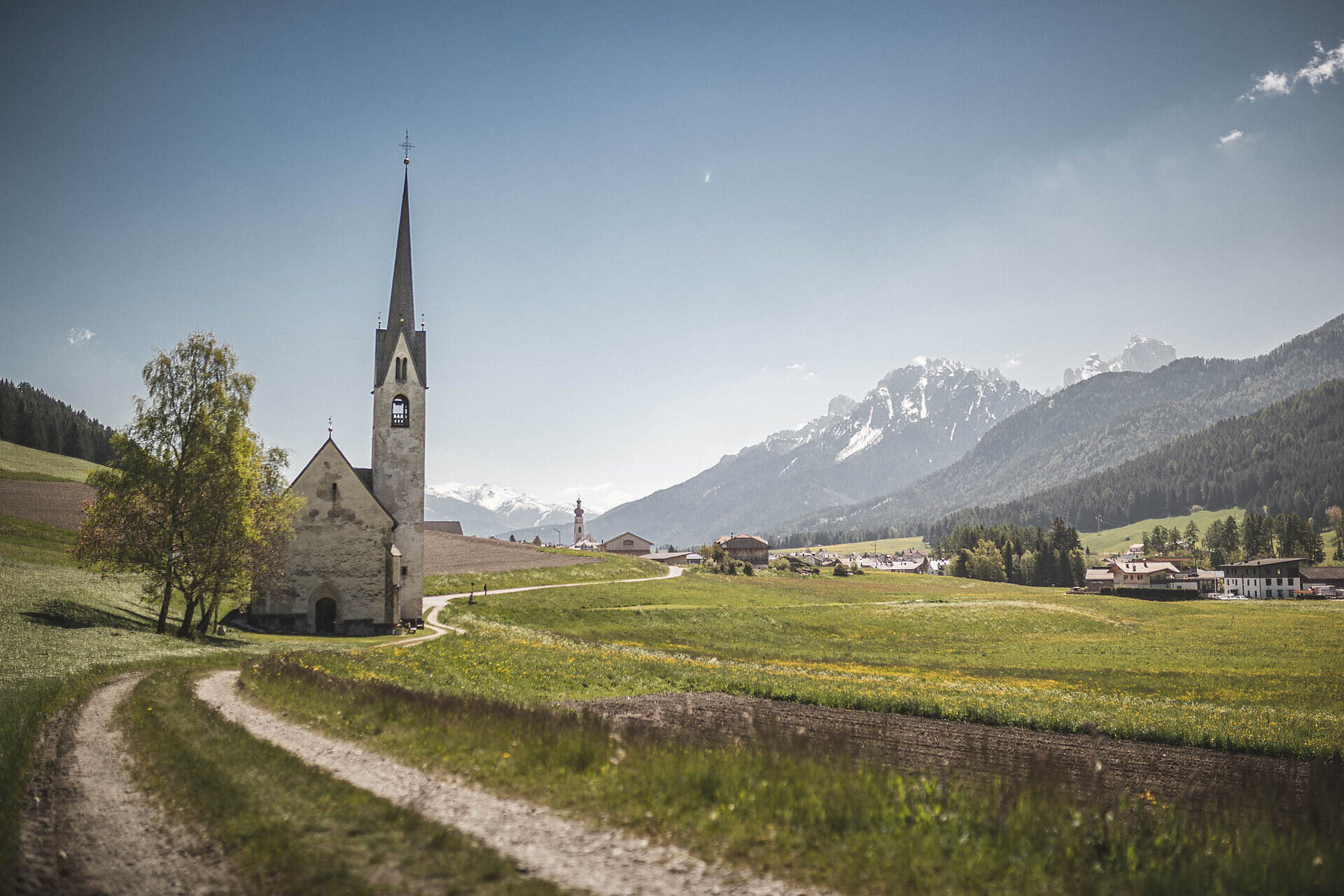 Da lì, il sentiero conduce lungo il margine del bosco in direzione della pittoresca Chiesetta di Santa Maddalena nel Moos – con una vista costante sul paese di Villabassa e sullo straordinario scenario montano delle Dolomiti di Braies.